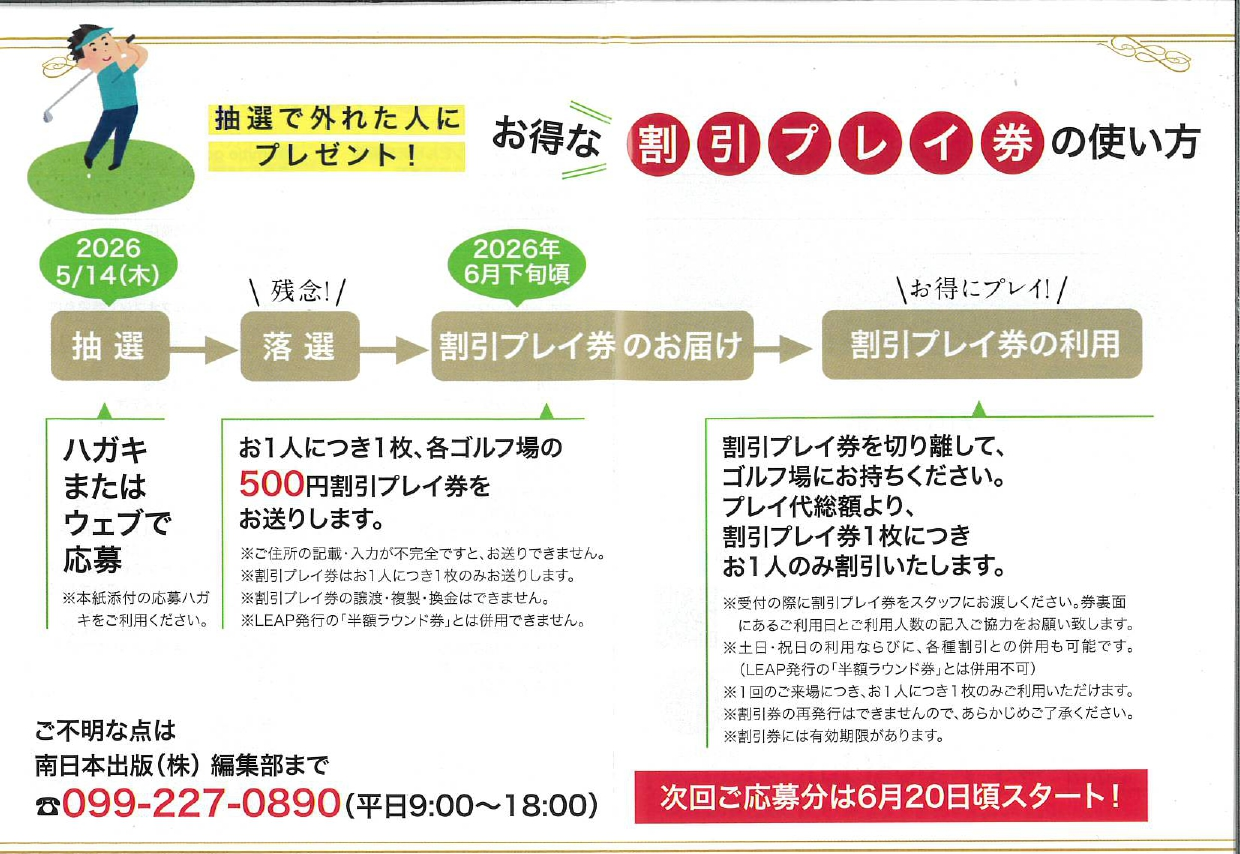 - 当選者は半額ラウンドゴルフ券到着後、各自でゴルフ場に予約を入れてください。
